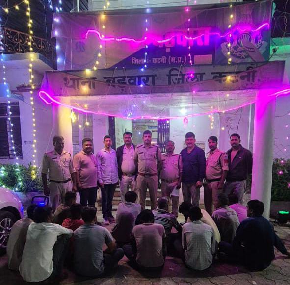 संदीप जायसवाल, कटनी। पुलिस अधीक्षक अभिनय विश्वकर्मा के द्वारा जुआ खेलने वालो के विरुद्ध प्रभावी कार्यवाही हेतु निर्देशन व पुलिस अधीक्षक संतोष डेहरिया एवं डीएसपी. हेडक्वाटर उमराव सिंह के मार्गदर्शन में जुआ फड़ों पर मुखबिर तंत्र सक्रियता में वरिष्ट अधिकारियो के मार्गदर्शन में क्षेत्र में लगातार भ्रमण कराया जा रहा था। दिनांक 21.10.2025 को थाना प्रभारी उनि के.के. पटेल हमराह स्टाफ के द्वारा इलाका भ्रमण के दौरान ग्राम नैगवां, झिंझरी एवं भुडसा में 02 स्थानों पर में जुआ फड़ों में बैठे कुछ व्यक्तियों को देखा जो मौके पर जाकर देखे तो 18 व्यक्ति 01. संदीप केवट पिता मन्जूलाल केवट उम्र : 28 निवासी : ग्राम नैगंवा 2. संजय सिंह पिता गुलाब सिंह उम्र : 29 निवासी : ग्राम नैंगंवा 03. राजेश सिंह पिता नत्थू सिंह उम्र : 28निवासी : ग्राम नैगंवा 04. प्रमोद केवट पिता मन्जूलाल केवट उम्र : 24 निवासी : ग्राम नैगंवा