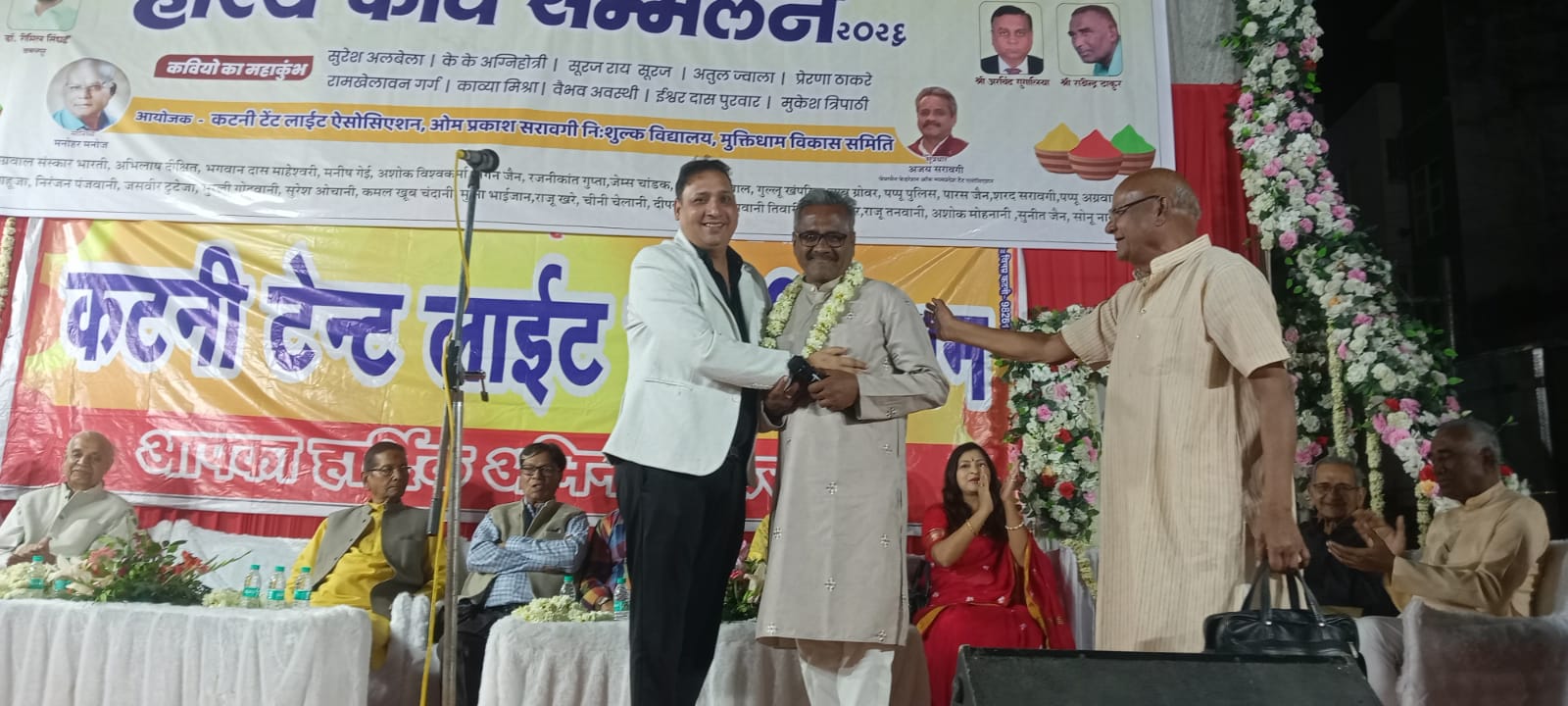 कविस्मेलन में कटनी टेंट लाईट एसोसिएशन अध्यक्ष अजय सरावगी द्बारा समाजसेवा में उत्कृष्ट कार्य करने वाली चार विभूतियों का अभिनंदन किया गया मैहर के प्रतिष्ठित चिकित्सक डा कैलाश जैन डा रोमिल सिंघई