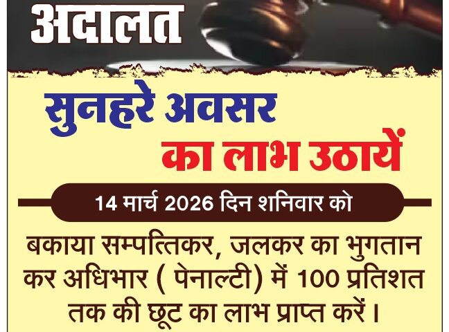 नगर निगम द्वारा नेशनल लोक अदालत का आयोजन 14 मार्च को पांच स्थलों में अधिभार में दी जाएगी विशेष छूट कटनी।